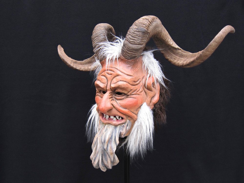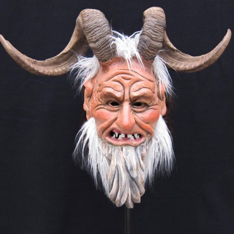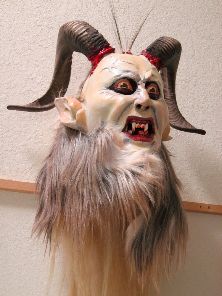 In many Alpine villages of southwestern Germany and Austria the tradition of Krampus and Perchten thrives. Both Krampus and Perchten costumes are quite elaborate. They wear hand-carved and painted Satin-like masks with horns protruding from them. They also wear ragged fur coats, dangling chains and cowbells.