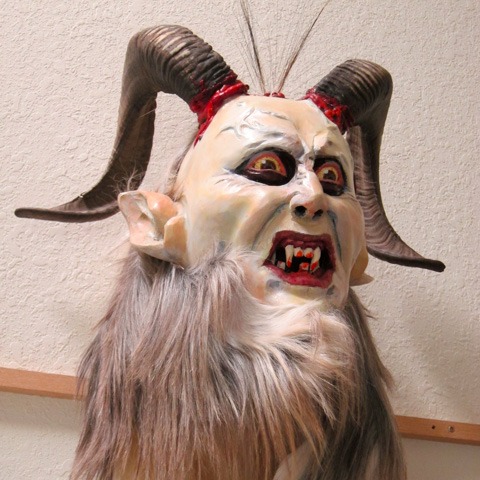 Krampus is a scary figure who appears with St. Nicholas on St. Nicholas Day (Dec. 6th). Often there are many Krampus that parade through the villages which bring about a mixture of horror, awe and amusement. After inquiring with the parents about the child's behavior, St. Nicholas hands out gifts to the children who have been good throughout the year. Krampus' role is to punish the bad ones, or at least scare them back onto the path of virtue.